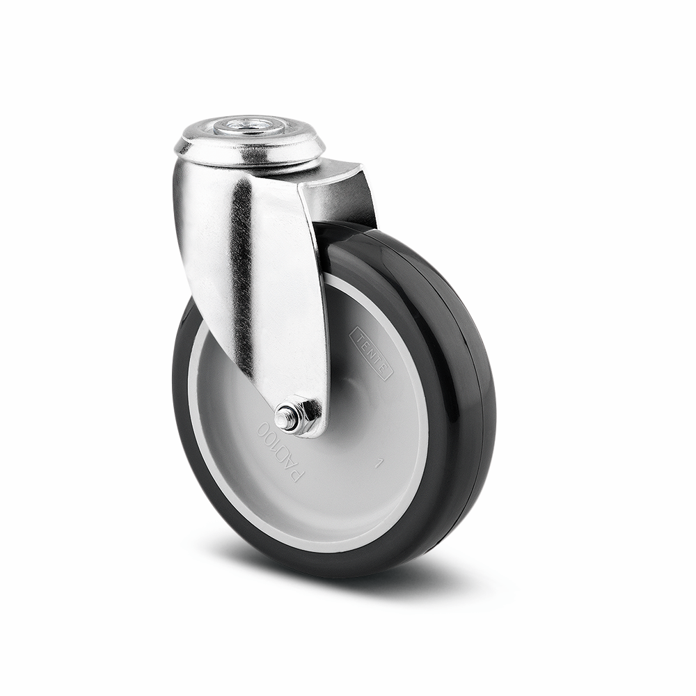 Lenkrolle, Gehäuse aus Stahlblech, glanzverzinkt, blaupassiviert, Schwenklager mit zweifachem Kugelkranz, Anschraubloch. Radkörper aus Polypropylen, Lauffläche aus Polyurethan, Gleitlager