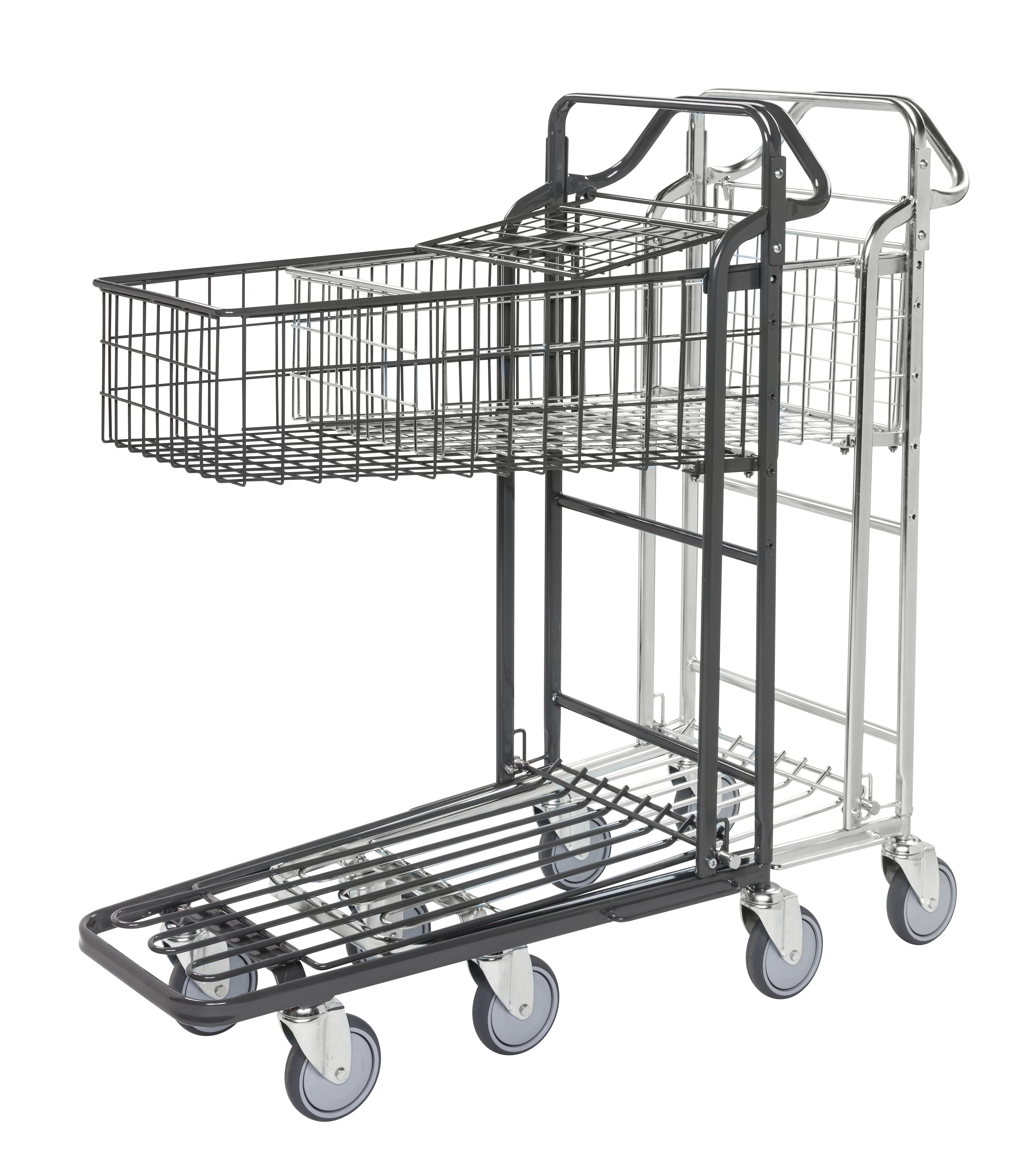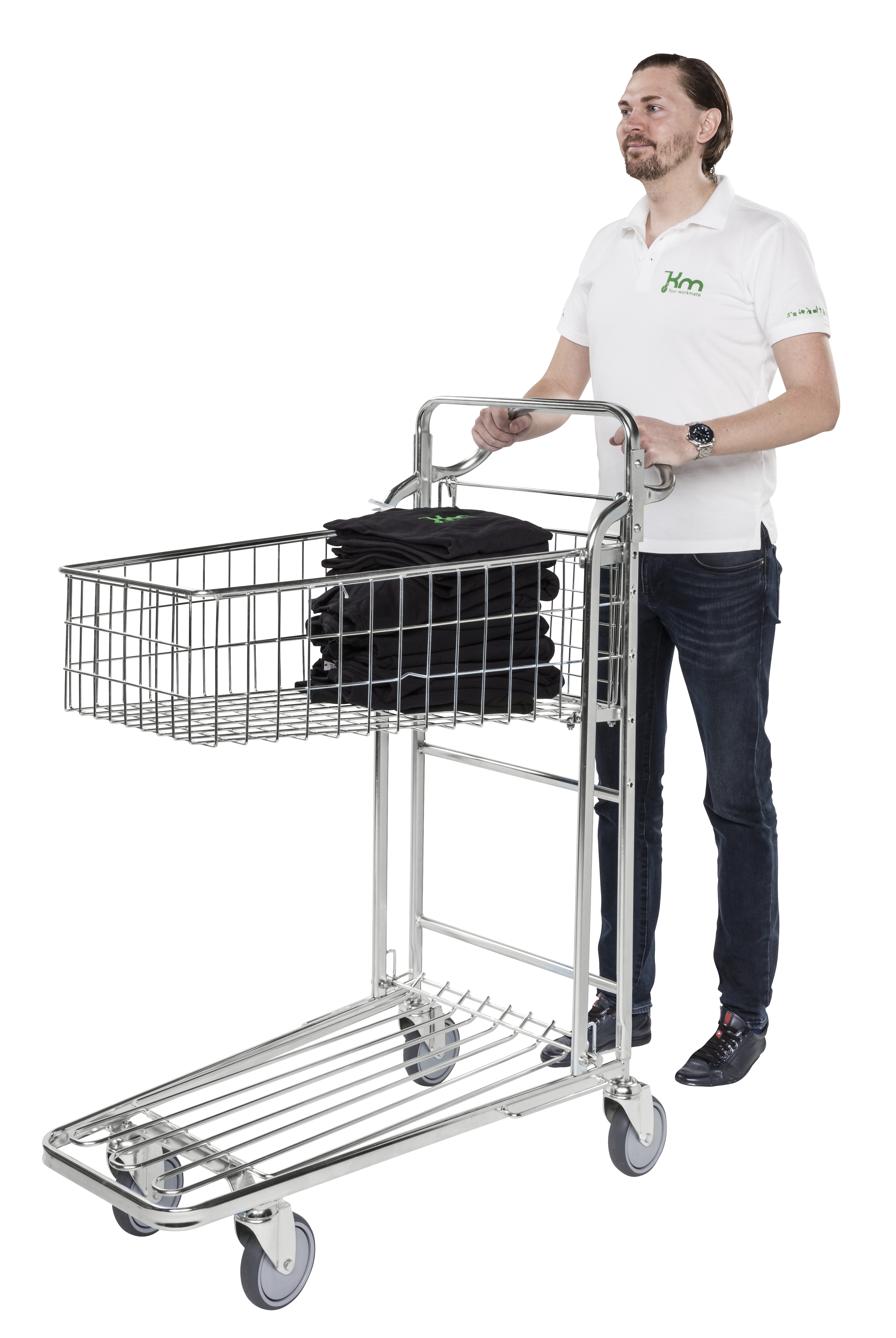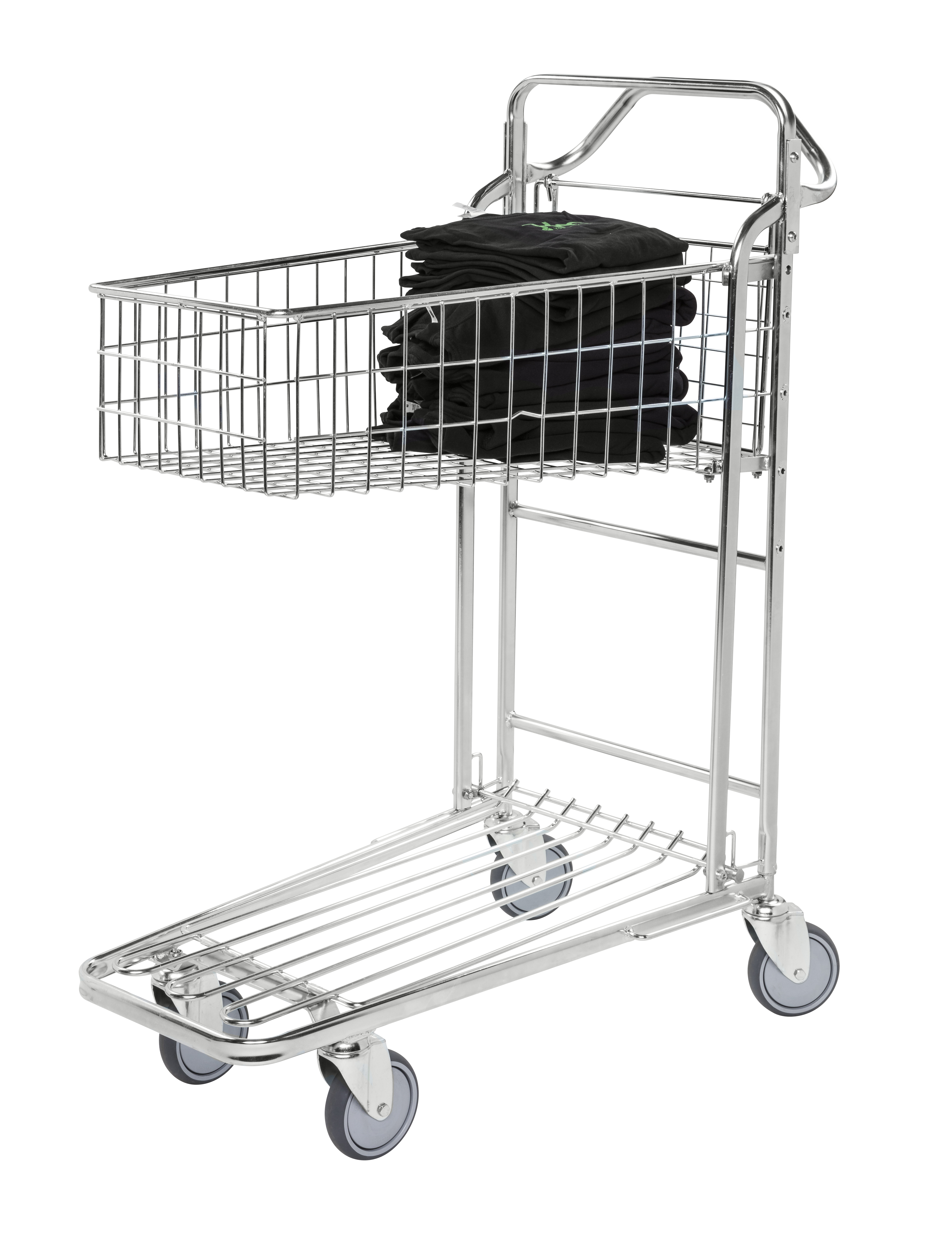 Ergonomischer Griff. 2 Böden. Höhe bis zum ersten Boden: 200 mm. Ladekapazität je Boden: 100 kg. Höhe zum Griff: 1200 mm. Rollen: 4 Lenkrollen. Rollendurchmesser: 125 mm.