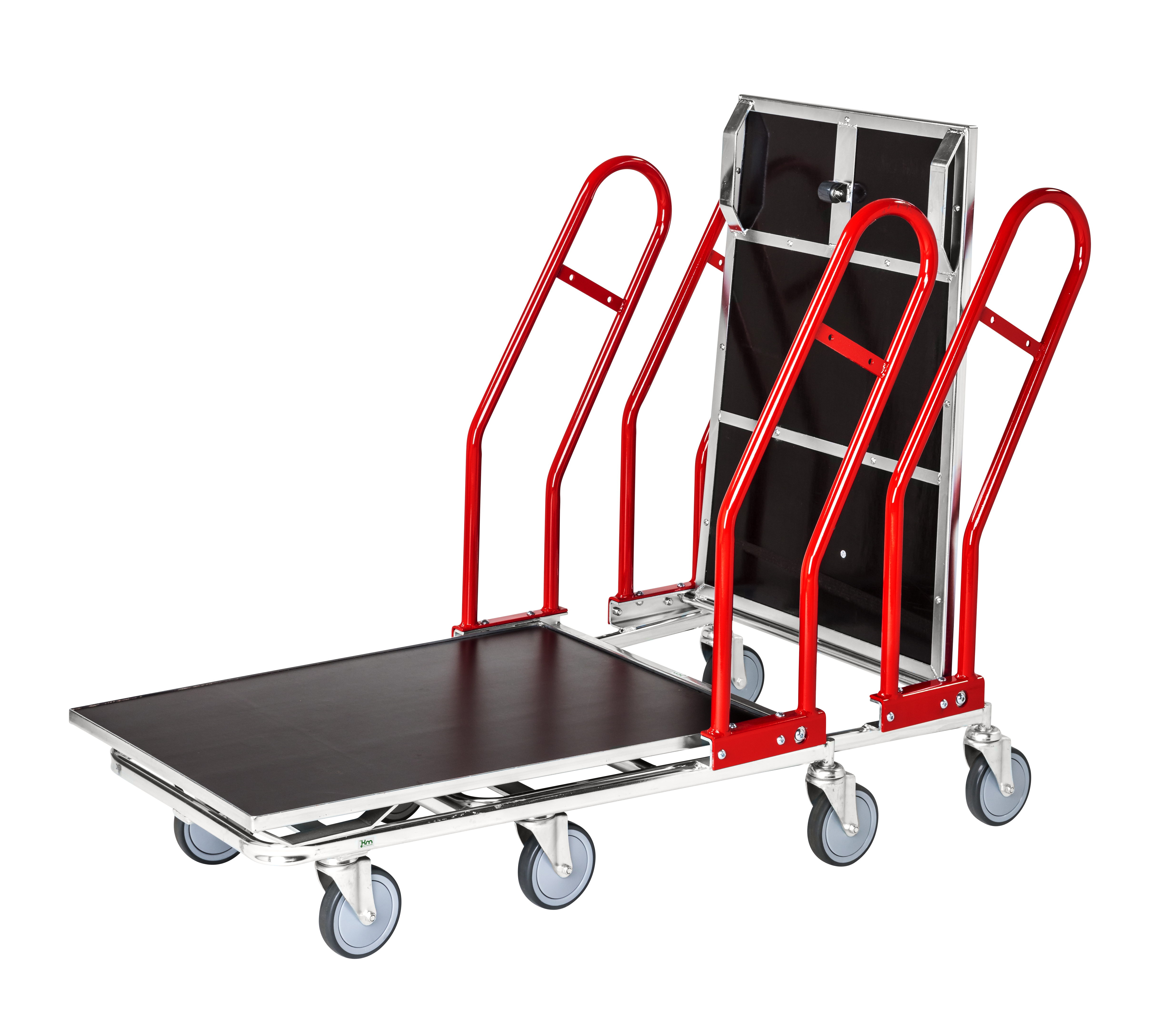 Grossgüterwagen mit versiegeltem Boden und ergonomischen Handgriff. Die Oberfläche macht es leicht, schwere Güter zu laden. Inklusive einem kleinen Korb unter dem Handgriff.