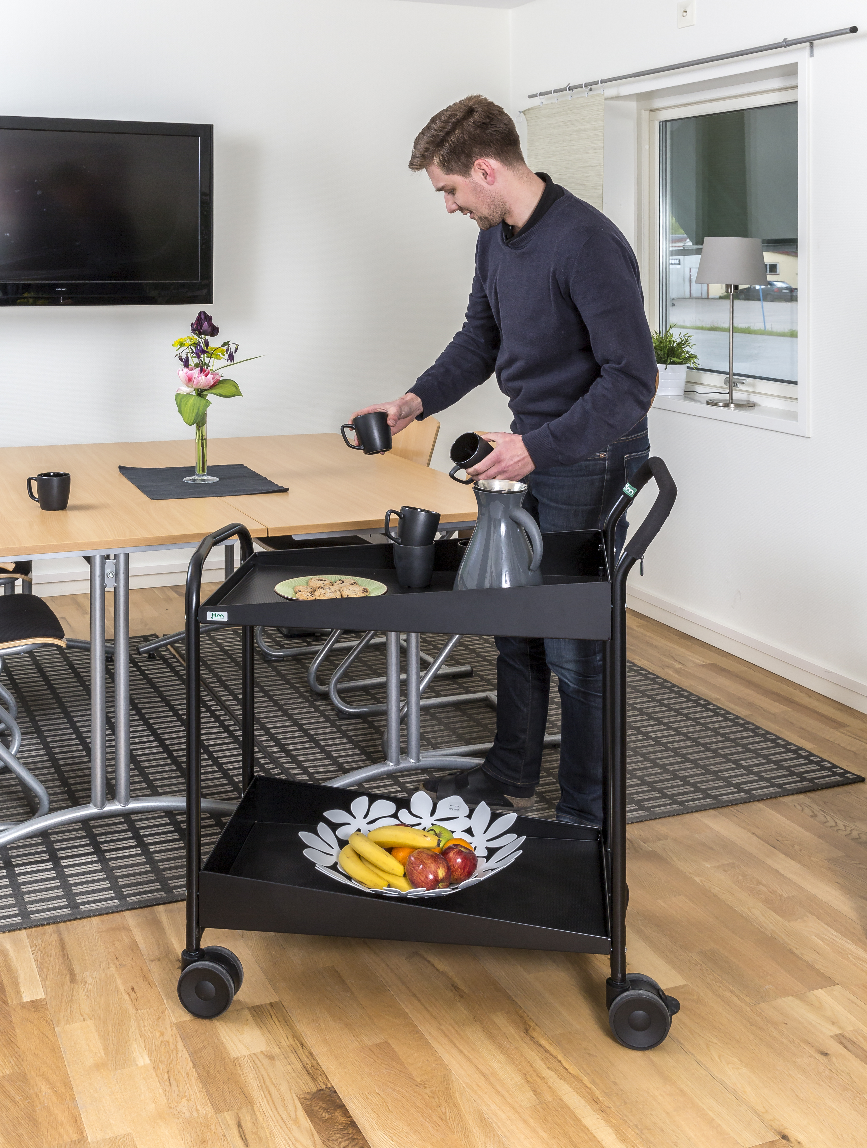 Servierwagen mit 2 Böden. Schwarze Gummimatten, mit kugelgelagerten Drehgestelldoppelrollen, das macht den Wagen elegant und leicht zu händeln. Der Wagen wird mit Softgriff KM600H geliefert, erhältlich in 3 Farben.