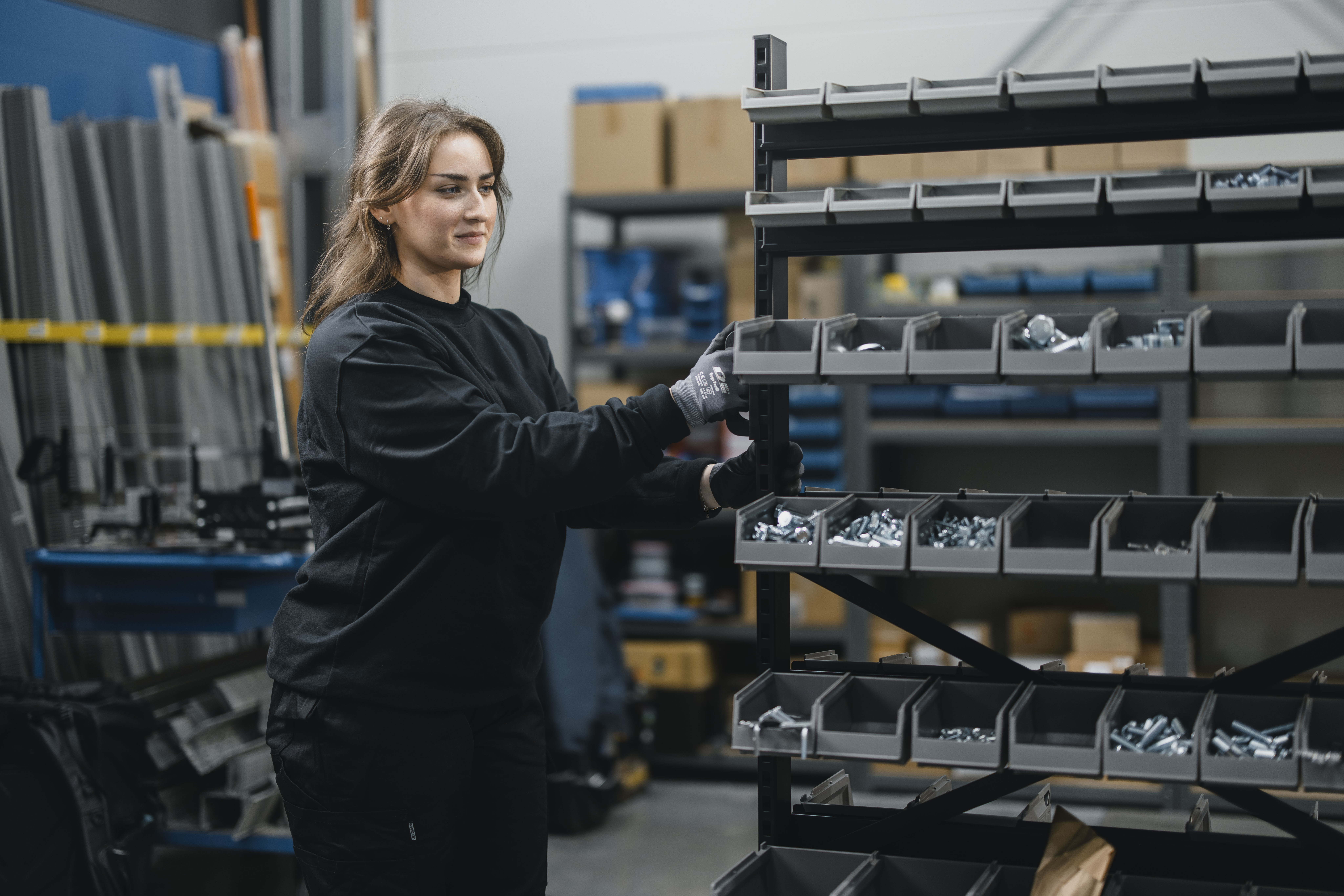 Doppelseitiger Kastenwagen mit 14 höhenverstellbaren Schienen. Behälter nicht im Lieferumfang enthalten.